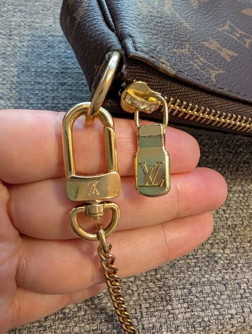 Last but not least, engraving is an area that fake bags often “miss.” The metal parts of an authentic bag have very clear engravings – the LV logo features thin, finely crafted lines. In contrast, fake bags often have dull or shallow engravings. If the shape of the LV logo looks uneven or if you feel the edges of the engraving are not sharp and are rough, it could indicate the bag is fake. For example, on my Mini Pochette, the zipper pull and the hook of the metal chain seem to be made of different materials, and the zipper pull feels much heavier.